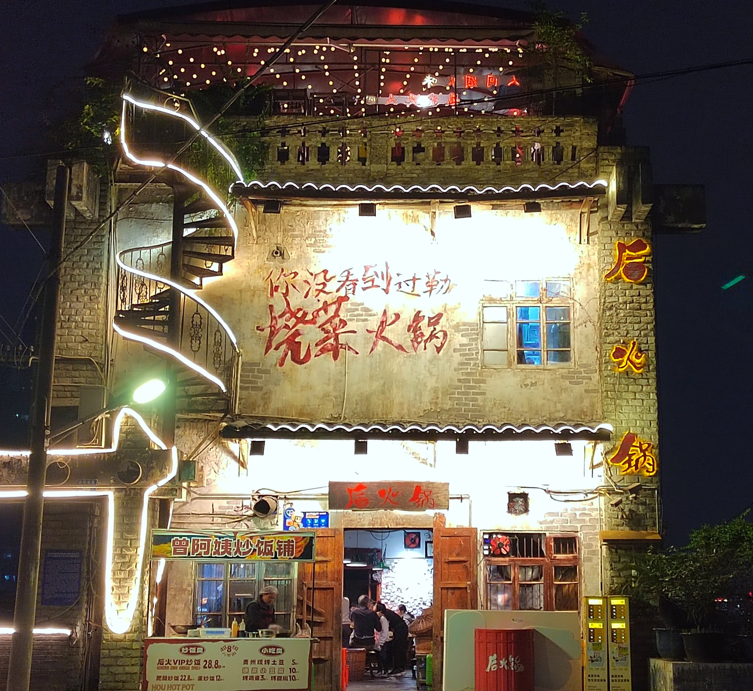 “后火锅”的门面相当朋克风,像被岁月的“炮弹”炸得伤痕累累,锈迹斑斑,但又一直不倒,浑身魅力,吸引很多人前来打卡,包括很多影视演员慕名而来。