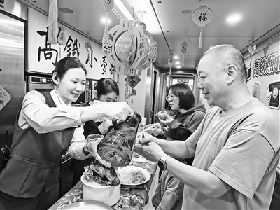 旅客在高铁餐车改造的特色小吃品鉴区品尝冰糖葫芦、冻梨、冻柿子、粘豆包等美食。春运首日,在沈阳至长白山G8155次列车上,旅客穿上免费地道的东北大花袄、戴上棉帽围巾,在“高铁照相馆”专区沉浸式拍照打卡。科技日报记者杨仑/文 郭晓冬/摄