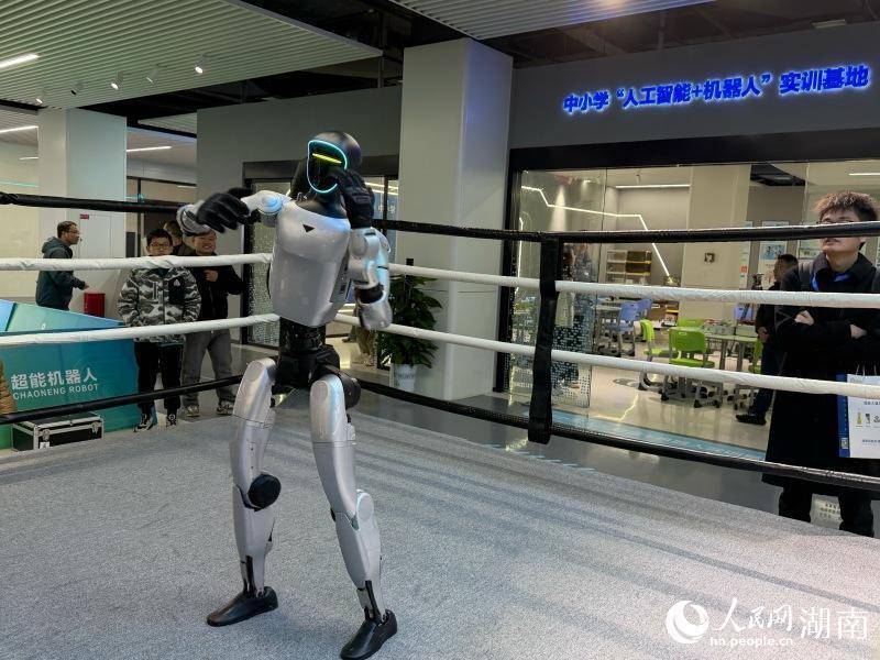 机器人打拳击。人民网记者 林洛頫摄人民网长沙2月11日电 (记者林洛頫)拳击机器人挥舞双拳、农业机器人除草、乒乓球机械手灵活发球、足球机器人运球射门、服务机器人按摩和搬运货物,场景交错呈现科技与应用的全景画面。